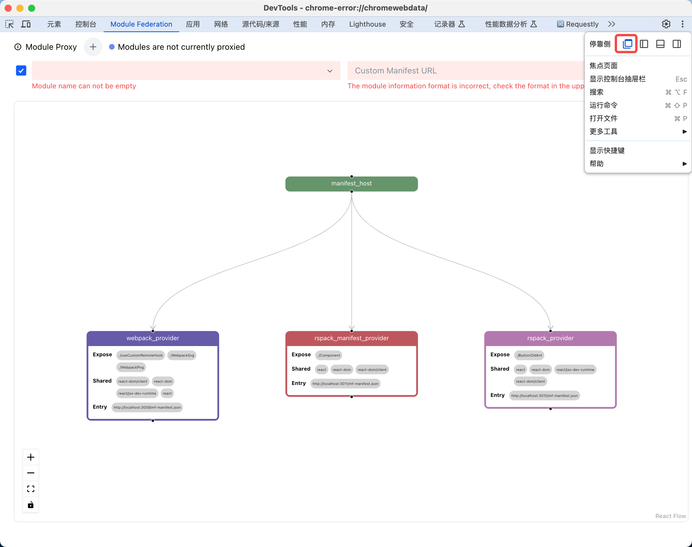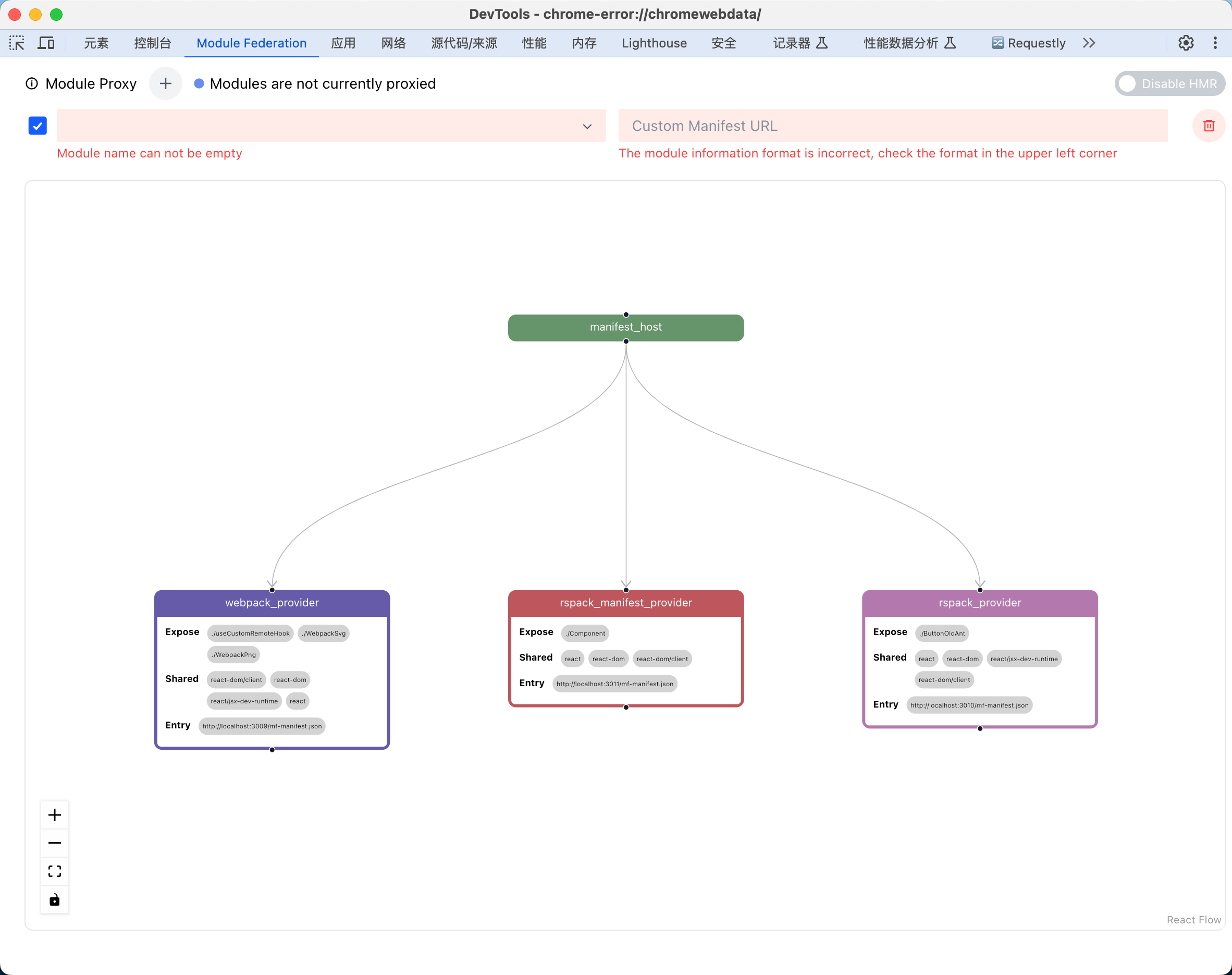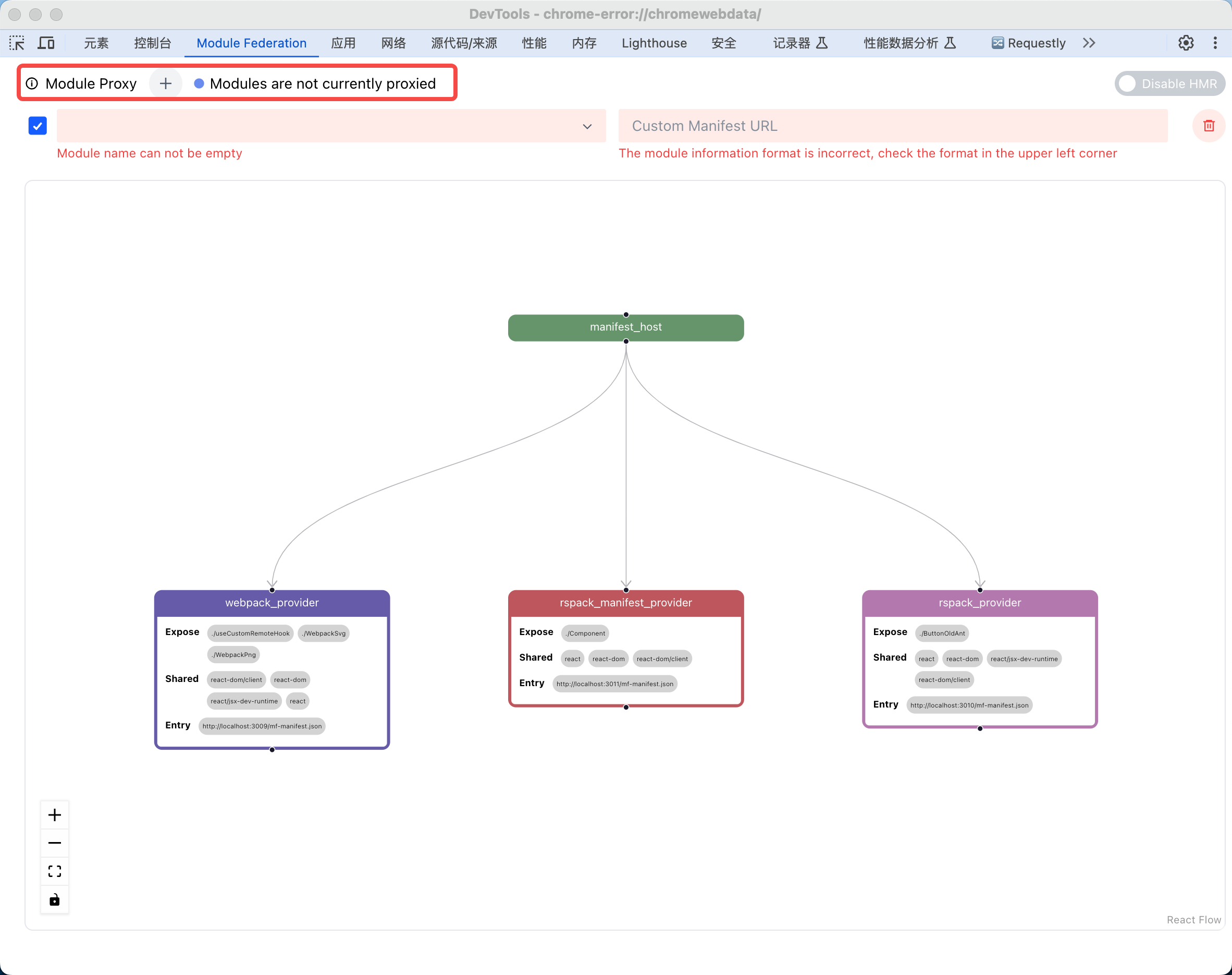 Module Federation proxy functionality, which proxies the Module Federation on the online page to the user's local Module Federation.Module Federation on the online page for rapid feature verification.You must use mf-manifest.json to utilize the visualization and proxy capabilities provided by Chrome DevTools.