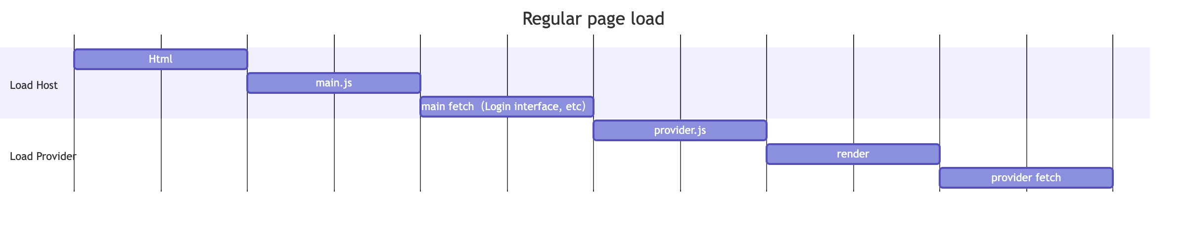 Host HTML(hosts HTML) -> Host main.js(hosts entry js) -> Host fetch(hosts authentication and other pre-actions) -> Provider main.js(producer entry js) -> Provider fetch(producer sends request)